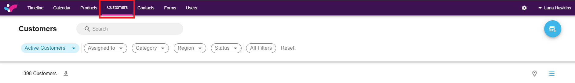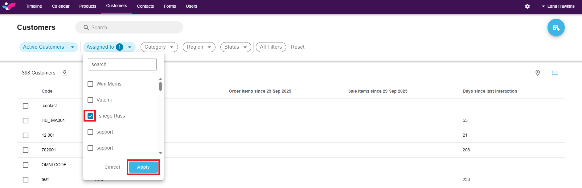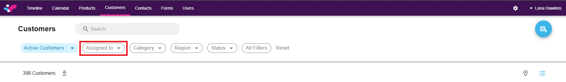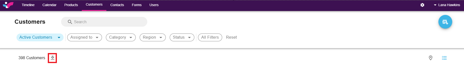 2. If you want to download a specific set of customers (for example, customers assigned to a specific user), click on that filter:
